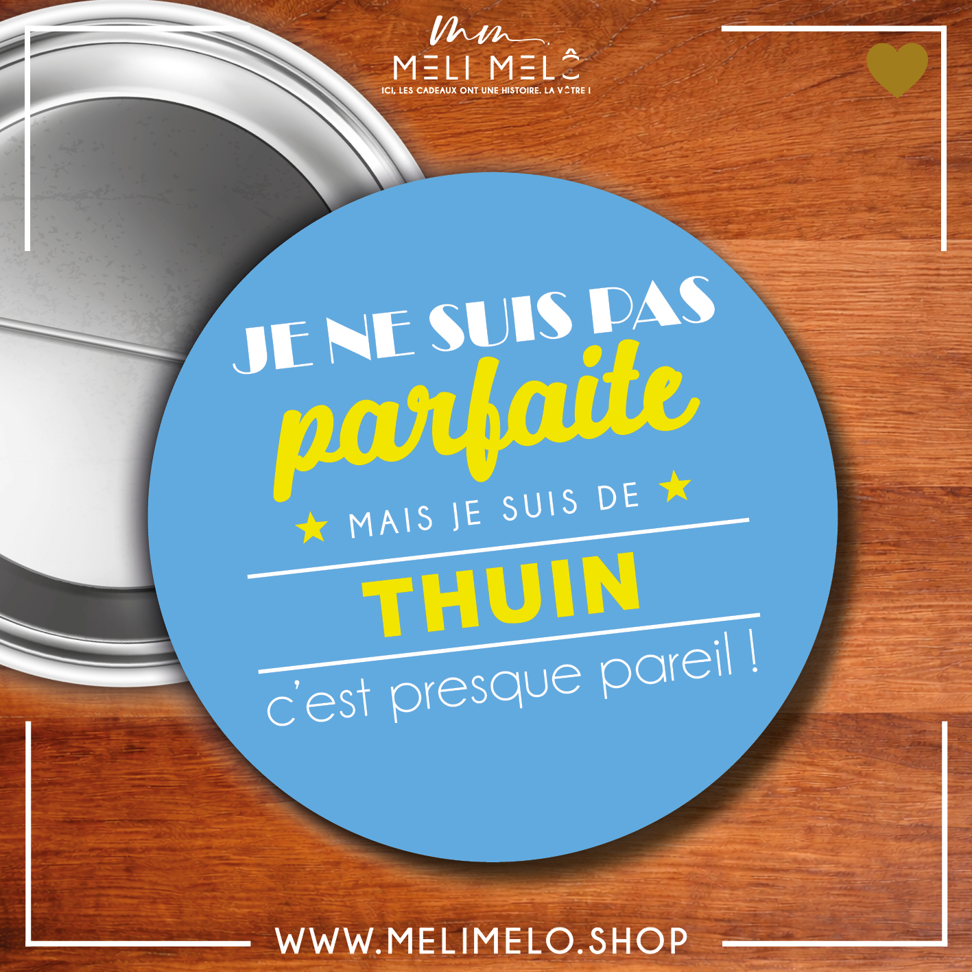 Badge à épingle – Je ne suis pas parfaite mais je suis de Thuin c’est presque pareil
